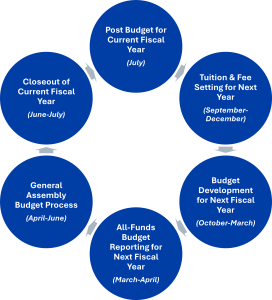 Each fiscal year happens more or less on the same schedule, with execution of the current year budget and development of the next year’s budget happening concurrently.